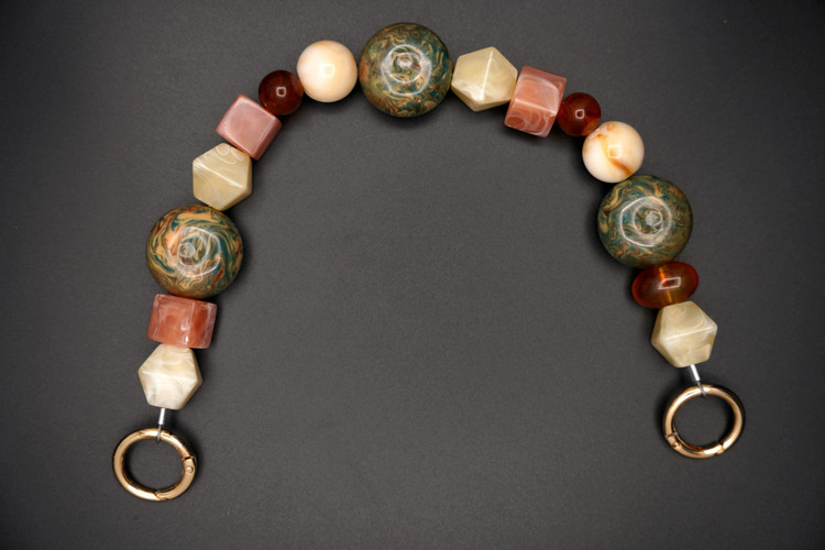 طراحی متنوع: ترکیب هندسی مهرهها (گرد، مربعی، ششضلعی) همراه با تنوع رنگی از کرم، قهوهای و سبز، این دسته را برای انواع کیفها مناسب میکند.