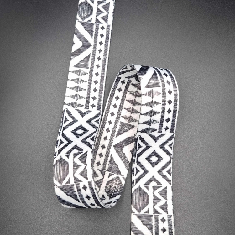 این بند پارچهای با عرض تقریبی ۳/۸ سانتیمتر، محصولی جذاب و مقاوم برای تزئین و تقویت کیفهای دستی، کولهپشتی، بند کیف شانهای یا حتی لوازم جانبی مانند بند ساعت و کیف پول است. ساختهشده از پارچه بافتدار با کیفیت (مانند نایلون یا پلیاستر)، این بند در برابر سایش، کشش و استفاده روزمره دوام بالایی دارد و برای پروژههای تولید صنعتی ایدهآل است. طراحی آن با زمینه سفید روشن و الگوهای هندسی سیاهرنگ (شامل اشکال مثلثی، لوزی و خطوط زاویهدار در سبک بوهو یا آزتک)، ظاهری مدرن، قبیلهای و پرجنبوجوش ایجاد میکند. این الگوها حس ماجراجویی، فرهنگهای بومی و سبکهای معاصر را القا میکنند و بند را به گزینهای عالی برای افزودن شخصیت به محصولات ساده تبدیل مینمایند.